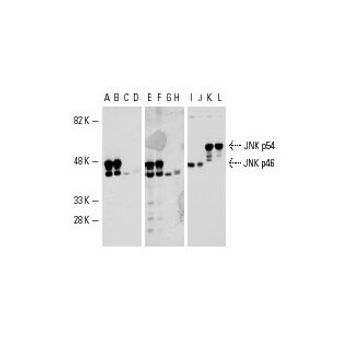 mouse monoclonal IgG1; JNK1 Antibody (F-3) is an IgG1 κ mouse monoclonal JNK1 antibody (also designated MAPK8 antibody or SAPK1 antibody) that detects the JNK1 protein of mouse, rat and human origin by WB, IP, IF and IHC(P). JNK1 Antibody (F-3) is available as both the non-conjugated anti-JNK1 antibody form, as well as multiple conjugated forms of anti-JNK1 antibody, including agarose, FITC and multiple Alexa Fluor® conjugates. c-Jun N-terminal kinases (JNKs) phosphorylate and augment transcriptional activity of c-Jun. JNKs originate from three genes that yield 10 isoforms through alternative mRNA splicing, including JNK1a1,JNK1b1, JNK2a1, JNK2b1, and JNK3a1, which represent the p46 isoforms, and JNK1a2, JNK1b2, JNK2a2, JNK2b2, and JNK3b2, which represent the p54 isoforms.JNKs coordinate cell responses to stress and influence regulation of cell growth and transformation. The human JNK1 (PRKM8, SAPK1, MAPK8) gene maps to chromosome 10q11.22 and shares 83% amino acid identity with JNK2. JNK1 is necessary for normal activation and differentiation of CD4 helper T (TH) cells into TH1 and TH2 effector cells. Capsaicin activates JNK1 and p38 in ras-transformed human breast epithelial cells. Nitrogen oxides (NOx) upregulate JNK1 in addition to c-Fos, c-Jun, and other signaling kinases, including MEKK1 and p38.
