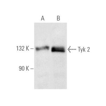 mouse monoclonal IgG1; Tyk 2 Antibody (C-8) is an IgG1 κ mouse monoclonal Tyk 2 antibody (also designated TYK2 antibody, Janus kinase (JAK) family protein tyrosine kinase antibody, JTK1 antibody, cytoplasmic type I / type II cytokine receptor interacting protein antibody, type I / type III interferon signaling pathway component antibody, or immune response / antiviral activity related protein antibody) that detects the Tyk 2 protein of mouse, rat and human origin by WB, IP, IF, IHC(P) and ELISA. Tyk 2 Antibody (C-8) is available as both the non-conjugated anti-Tyk 2 antibody form, as well as multiple conjugated forms of anti-Tyk 2 antibody, including agarose, HRP, PE, FITC and multiple Alexa Fluor® conjugates. Tyk 2 belongs to the family of non-receptor janus tyrosine kinases, which regulate a spectrum of cellular functions occurring downstream of activated cytokine receptors in the lympho-hematopoietic system. Immunological stimuli, such as interferons and cytokines, recruit STAT transcription factors to the cytokine receptor where Tyk 2 is associated. Tyk 2 then phosphorylates proximal STAT factors, which subsequently dimerize, translocate to the nucleus, and bind to cis elements upstream of target gene promoters to regulating transcription. The canonical JAK-STAT pathway is integral to maintaining a normal immune system by stimulating proliferation, differentiation, survival, and host resistance to pathogens. Cytokine induced pro-inflammatory responses are attractive targets for anti-inflammatory therapies, specifically at the level of Jak-STAT signaling.