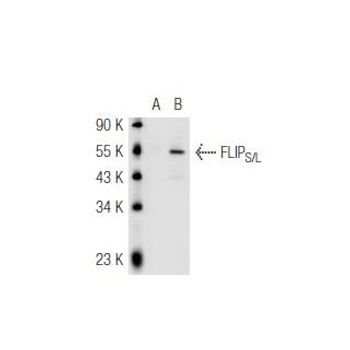 mouse monoclonal IgG1; FLIPS/L Antibody (G-11) is an IgG1 κ mouse monoclonal FLIPS/L antibody (also designated FLIP antibody, CFLAR antibody, or c-FLIP antibody) that detects the FLIPS/L protein of mouse, rat and human origin by WB, IP, IF and ELISA. FLIPS/L Antibody (G-11) is available as both the non-conjugated anti-FLIPS/L antibody form, as well as multiple conjugated forms of anti-FLIPS/L antibody, including agarose, HRP, PE, FITC and multiple Alexa Fluor® conjugates. FLIP (FLICE inhibitory protein) is expressed as both long and short forms and is involved in the regulation of apoptosis. The short form of FLIP contains two death effector domains homologous to the death effector domain of the FAS-associating protein FADD. The long form of FLIP, which shares significant homology with the cysteine protease FLICE, contains an additional caspase-like domain, but lacks a catalytic active site and lacks the residues that form the substrate binding pocket in most caspases. FLIP has been designated by independent groups as Casper, I-FLICE, CLARP, FLAME-1 and MRIT. Although its exact role is still being elucidated, FLIP appears to be an important factor in the regulation of apoptosis downstream of all known death receptors.
