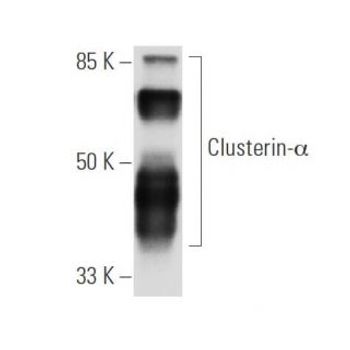 mouse monoclonal IgG1; Clusterin-α Antibody (B-5) is an IgG1 κ mouse monoclonal Clusterin-alpha antibody (also designated CLU antibody, KUB1 antibody, APOJ antibody and Apolipoprotein J antibody) that detects the Clusterin-alpha protein of human origin by WB, IP, IF, IHC(P) and ELISA. Clusterin-α Antibody (B-5) is available as both the non-conjugated anti-Clusterin-alpha antibody form, as well as multiple conjugated forms of anti-Clusterin-alpha antibody, including agarose, HRP, PE, FITC and multiple Alexa Fluor® conjugates. Clusterin, also designated complement lysis inhibitor (CLI), apolipoprotein J (ApoJ), sulfated glycoprotein 2 (SGP2), SP-40 and testosterone-repressed prostate message 2 (TRPM2), is a secretory, heterodimeric glycoprotein that influences immune regulation, cell adhesion, transformation, lipid transportation, tissue remodeling, membrane recycling and cell-cell interactions. Clusterin is synthesized as a 449 amino acid polypeptide that is post-translationally cleaved at an internal bond between Arg 227 and Ser 228. Two subunits, α and β, are associated through disulfide bonds. The β subunit (also called ApoJα) corresponds to residues 23-227. The α subunit (also called ApoJβ) corresponds to residues 228-449. Overexpression of Clusterin appears to be more common in late stages of mammary tumor progression. Clusterin markedly influences β-Amyloid structure and neuritic toxicity in vivo and may influence Alzheimer's disease pathogenesis.