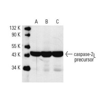 mouse monoclonal IgG1; caspase-2L Antibody (F-7) is an IgG1 κ mouse monoclonal caspase-2L antibody that detects p13 subunit, caspase-2L and full length caspase-2 precursor of mouse, rat and human origin by WB, IP, IF and ELISA. caspase-2L Antibody (F-7) is available as the non-conjugated anti-caspase-2L antibody form, as well as multiple conjugated forms of anti-caspase-2L antibody, including agarose, HRP, PE, FITC and multiple Alexa Fluor® conjugates. Caspase-2 (Nedd2, Ich-1) is an aspartate-specific cysteine protease that is activated in response to various apoptotic stimuli. Caspase-2 is unique among the caspases in that it has features of both upstream caspases (long prodomain) and downstream caspases (DEXD substrate specificity). Caspase-2 is highly expressed in the brain during development, and is expressed at low levels in adult tissue. Specifically, caspase-2 localizes to the mitochondria, the Golgi, the cytoplasm, and the nucleus. Caspase-2 exists as two isoforms, caspase-2L and caspase-2S, which are produced by alternative splicing and differ in their N and C-termini. Caspase-2L acts as a positive regulator of apoptosis, whereas caspase-2S functions as a negative regulator of apoptosis. Following apoptotic stimuli, the caspase-2L precursor undergoes cleavage at Asp 153 to produce a fragment p30. The p30 fragment undergoes further cleavage to generate a fragment containing amino acids 153-308 (p18) and a fragment containing amino acids 317-435 (p13 or p14). As apoptosis progresses, the p13 (p14) fragment can undergo further processing to yield a fragment containing amino acids 331-435 (p12).