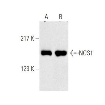 mouse monoclonal IgG1; NOS1 Antibody (A-11) is an IgG1 κ mouse monoclonal NOS1 antibody (also designated bNOS antibody or nNos antibody) that detects the NOS1 protein of mouse, rat and human origin by WB, IP, IF and ELISA. NOS1 Antibody (A-11) is available as both the non-conjugated anti-NOS1 antibody form, as well as multiple conjugated forms of anti-NOS1 antibody, including agarose, HRP, PE, FITC and multiple Alexa Fluor® conjugates. Nitric oxide (NO) has a broad range of biological activities and has been implicated in signaling pathways in phylogenetically diverse species. Nitric oxide synthases (NOSs), the enzymes responsible for synthesis of NO, contain an N-terminal oxygenase domain and a C-terminal reductase domain. NOS activity requires homodimerization as well as three cosubstrates (L-arginine, NADPH and O2) and five cofactors or prosthetic groups (FAD, FMN, calmodulin, tetrahydrobiopterin and heme). Several distinct NOS isoforms have been described and been shown to represent the products of three distinct genes. These include two constitutive Ca2+/CaM-dependent forms of NOS, including NOS1 (also designated ncNOS) whose activity was first identified in neurons, and NOS3 (also designated ecNOS), first identified in endothelial cells. The inducible form of NOS, NOS2 (also designated iNOS), is Ca2+-independent and is expressed in a broad range of cell types.