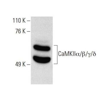 mouse monoclonal IgG1; CaMKIIα/β/γ/δ Antibody (G-1) is an IgG1 κ mouse monoclonal CaMKIIα/β/γ/δ antibody (also designated CAMK2A antibody or calcium/calmodulin dependent protein kinase II alpha/beta/gamma/delta antibody) that detects the CaMKIIα/β/γ/δ protein of mouse, rat and human origin by WB, IP, IF, IHC(P) and ELISA. CaMKIIα/β/γ/δ Antibody (G-1) is available as both the non-conjugated anti-CaMKIIα/β/γ/δ antibody form, as well as multiple conjugated forms of anti-CaMKIIα/β/γ/δ antibody, including agarose, HRP, PE, FITC and multiple Alexa Fluor® conjugates. The Ca2+/calmodulin-dependent protein kinases (CaM kinases) comprise a structurally related subfamily of serine/threonine kinases which include CaMKI, CaMKII and CaMKIV. CaMKII is a ubiquitously expressed serine/threonine protein kinase that is activated by Ca2+ and calmodulin (CaM) and has been implicated in regulation of the cell cycle and transcription. There are four CaMKII isozymes designated α, β, γ and δ, which may or may not be co-expressed in the same tissue type. CaMKIV is stimulated by Ca2+ and CaM but also requires phosphorylation by a CaMK for full activation. Stimulation of the T cell receptor CD3 signaling complex with an anti-CD3 monoclonal antibody leads to a 10-40 fold increase in CaMKIV activity. An additional kinase, CaMKK, functions to activate CaMKI through the specific phosphorylation of the regulatory Threonine residue at position 177.