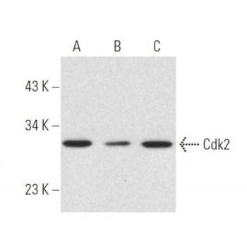 mouse monoclonal IgG1; Cdk2 Antibody (D-12) is an IgG1 κ mouse monoclonal Cdk2 antibody that detects Cdk2 of mouse, rat and human origin by WB, IP, IF and ELISA. Cdk2 Antibody (D-12) is available as the non-conjugated anti-Cdk2 antibody form, as well as multiple conjugated forms of anti-Cdk2 antibody, including agarose, HRP, PE, FITC and multiple Alexa Fluor® conjugates. In vertebrates, as in yeast, multiple cyclins have been identified, including a total of eight such regulatory proteins in mammals. In contrast to the situation in yeast, the Cdc2 p34 kinase is not the only catalytic subunit identified in vertebrates that can interact with cyclins. While Cdc2 p34 is essential for the G2 to M transition in vertebrate cells, a second Cdc2-related kinase has also been implicated in cell cycle control. This protein, designated cyclin-dependent kinase 2 (Cdk2) p33, also binds to cyclins and its kinase activity is temporally regulated during the cell cycle. Several additional Cdc2 p34-related cyclin dependent kinases have been identified. These include Cdk3-Cdk8, PCTAIRE-1-3 and KKIALRE.