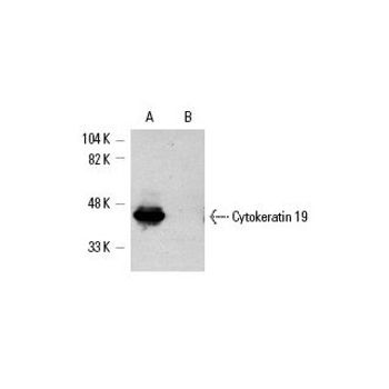 mouse monoclonal IgG2a; Cytokeratin 19 Antibody (A53-B/A2) is an IgG2a κ mouse monoclonal Cytokeratin 19 antibody (also designated Cytokeratin 19 antibody or KRT19 antibody) that detects amino acids 312-335 of Cytokeratin 19 of human origin by WB, IP, IF and IHC(P). Cytokeratin 19 Antibody (A53-B/A2) is available as the non-conjugated anti-Cytokeratin 19 antibody form, as well as multiple conjugated forms of anti-Cytokeratin 19 antibody, including agarose, HRP, PE, FITC and multiple Alexa Fluor® conjugates. Cytokeratins comprise a diverse group of intermediate filament proteins (IFPs) that are expressed as pairs in both keratinized and non-keratinized epithelial tissue. Cytokeratins play a critical role in differentiation and tissue specialization and function to maintain the overall structural integrity of epithelial cells and have been found to be useful markers of tissue differentiation, which is directly applicable to the characterization of malignant tumors. For example, many types of cancer cells express Cytokeratin 19 (CK19), an epithelial cytoskeletal protein within the suprabasal squamous epithelium. Cytokeratin 19 is a specific marker of moderate to severe dysplasia and carcinoma in situ in oral cavity squamous epithelium, and measurement of Cytokeratin 19 may be a useful marker in diagnosing hepatoma. Cytokeratin 19 fragment levels in serum have been documented as a marker for lung cancer. Clinical investigations have suggested that serum CYFRA 21-1, a fragment of Cytokeratin 19, may be among the most useful tumor markers.