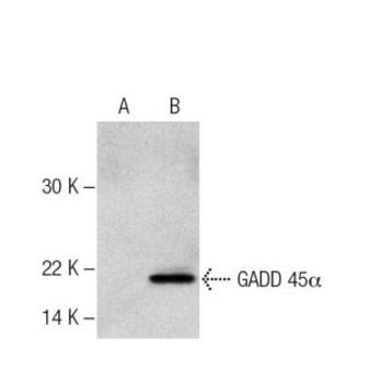 mouse monoclonal IgG1; GADD 45α Antibody (C-4) is an IgG1 κ mouse monoclonal GADD 45 alpha antibody (also designated GADD45A antibody, Growth arrest and DNA damage inducible protein 45 alpha antibody, or GADD45 antibody) that detects the GADD 45 alpha protein of mouse, rat and human origin by WB, IP, IF, FCM and ELISA. GADD 45α Antibody (C-4) is available as both the non-conjugated anti-GADD 45 alpha antibody form, as well as multiple conjugated forms of anti-GADD 45 alpha antibody, including agarose, HRP, PE, FITC and multiple Alexa Fluor® conjugates. It is well established that cell cycle progression is subject to arrest at G1 and G2 checkpoints in response to DNA damage, presumably to allow time for DNA repair prior to entry into S and M phase, respectively. The p53 tumor suppressor is required for one such G1 checkpoint and functions to upregulate expression of GADD 45 and p21. p21 functions to inhibit the kinase activity of multiple Cdk complexes, which may account for its suppression of cell growth. GADD 45 binds both Cdks and PCNA, a protein involved in DNA replication and repair. GADD 45 has been shown to stimulate DNA excision repair in vitro and to inhibit entry of cells into S phase. Thus, it has been suggested that GADD 45 may serve as a link between p53-dependent cell cycle checkpoint and DNA repair.