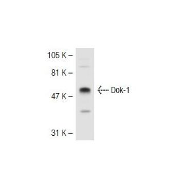 mouse monoclonal IgG1; Dok-1 Antibody (A-3) is an IgG1 κ mouse monoclonal Dok-1 antibody (also designated DOK1 antibody) that detects the Dok-1 protein of mouse, rat and human origin by WB, IP, IF and IHC(P). Dok-1 Antibody (A-3) is available as both the non-conjugated anti-Dok-1 antibody form, as well as multiple conjugated forms of anti-Dok-1 antibody, including agarose, HRP, PE, FITC and multiple Alexa Fluor® conjugates. Dok-1 associates with the Ras GTPase-activating protein (Ras GAP) upon tyrosine phosphorylation. Evidence suggests that Dok-1 (also designated p62dok) is a substrate of the constitutive tyrosine kinase activity of p210 Bcr-Abl, a fusion protein caused by the t(9;22) translocation and associated with chronic myelogenous leukemia. Dok-1, as well as the tyrosine kinase substrates IRS-1 and Cas, are members of a class of "docking" proteins which contain multiple tyrosine residues and putative SH2 binding sites. Dok-1 is suspected to be the substrate phosphorylated in response to stimulation by a number of growth factors, including PDGF, VEGF, insulin and IGF. Dok-2 (also designated p56dok) has also been identified as a potential mediator of the effects of p210 Bcr-Abl.