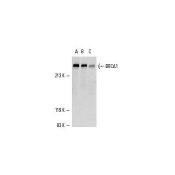 mouse monoclonal IgG2a; BRCA1 Antibody (D-9) is an IgG2a κ mouse monoclonal BRCA1 antibody (also designated Breast cancer type 1 susceptibility protein antibody) that detects the BRCA1 protein of human origin by WB, IP, IF and ELISA. BRCA1 Antibody (D-9) is available as both the non-conjugated anti-BRCA1 antibody form, as well as multiple conjugated forms of anti-BRCA1 antibody, including agarose, HRP, PE, FITC and multiple Alexa Fluor® conjugates. In 1990, a breast cancer susceptibility gene, designated BRCA1, was localized to chromosome 17q. Mutations within this gene are believed to account for approximately 45% of families with high incidence of breast cancer and at least 80% of families with increased incidence of both early-onset breast cancer and ovarian cancer. A second breast cancer susceptibility gene, BRCA2, located on chromosome 13q13.1, also confers a high incidence of breast cancer but, unlike BRCA1, does not confer a substantially elevated risk of ovarian cancer. The BRCA1 gene is expressed in numerous tissues, including breast and ovary, and encodes a predicted protein of 1863 amino acids. This protein contains a zinc finger domain in its amino terminal region, but is otherwise unrelated to any previously described proteins. Like many other genes involved in familial cancer, BRCA1 appears to encode a tumor suppressor, a protein that acts as a negative regulator of tumor growth.