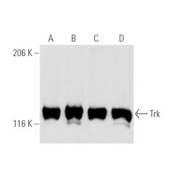 mouse monoclonal IgG2a; Trk Antibody (B-3) is an IgG2a κ mouse monoclonal Trk antibody (also designated Pan Trk antibody, TRKA/B/C antibody or NTRK1/2/3 antibody ) that detects the Trk protein of mouse, rat and human origin by WB, IP, IF, IHC(P) and ELISA. Trk Antibody (B-3) is available as both the non-conjugated anti-Trk antibody form, as well as multiple conjugated forms of anti-Trk antibody, including agarose, HRP, PE, FITC and multiple Alexa Fluor® conjugates. The Trk proto-oncogene encodes a tyrosine protein kinase, Trk A, also designated Trk gp140, that serves as a receptor for certain neurotrophic factors including nerve growth factor (NGF) and neurotrophin-3 (NT-3). Trk B is a tyrosine kinase gene highly related to Trk A. Trk B expression is confined to tissues within the central and peripheral nervous systems. The brain-derived neurotrophic factor (BDNF) and NT-3, but not NGF, can induce rapid phosphorylation on Tyrosine of Trk B gp145, one of the receptors encoded by Trk B, although BDNF elicits a response at least two orders of magnitude greater than NT-3. Thus it appears that Trk B gp145 may represent a neurotrophic receptor for BDNF and NT-3. The third member of the Trk family of tyrosine kinases, Trk C, encodes a protein designated Trk C gp145 that is preferentially expressed in brain tissue, is equally related to Trk A and Trk B and is a functional receptor for neurotrophin-3 (NT-3).