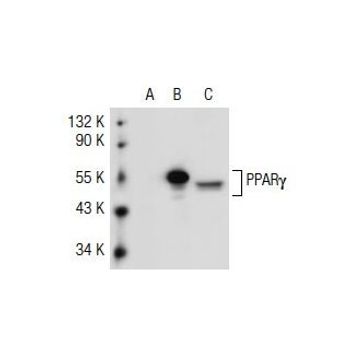 mouse monoclonal IgG1; PPARγ Antibody (E-8) is an IgG1 κ mouse monoclonal PPAR gamma antibody (also designated PPARG antibody) that detects the PPAR gamma protein of mouse, rat and human origin by WB, IP, IF, IHC(P) and ELISA. PPARγ Antibody (E-8) is available as both the non-conjugated anti-PPAR gamma antibody form, as well as multiple conjugated forms of anti-PPAR gamma antibody, including agarose, PE, FITC and multiple Alexa Fluor® conjugates. PPARs are members of the nuclear hormone receptor subfamily of transcription factors. PPARs form heterodimers with retinoid X receptors (RXRs). These heterodimers regulate transcription of genes involved in insulin action, adipocyte differentiation, lipid metabolism and inflammation. PPARγ is implicated in numerous diseases including obesity, diabetes, atherosclerosis and cancer, making the PPARγ antibody an important research tool. PPARγ activators include prostanoids, fatty acids, thiazolidinediones and N-(2-benzoylphenyl) tyrosine analogues. A key component in adipocyte differentiation and fat-specific gene expression, PPARγ may modulate macrophage functions such as proinflammatory activities, and stimulate oxidized low-density lipoprotein (x-LDL) uptake. A Pro12Ala polymorphism of the PPARγ2 gene has been reported to reduce transactivation activity in vitro. This substitution may affect the immune response to ox-LDL and be associated with type 2 diabetes. In addition, the Pro12Ala variant of the PPARγ2 gene maybe correlated with abdominal obesity in type 2 diabetes. The PPARγ Antibody (E-8) is recommended for detection of both PPARγ1 and PPARγ2 gene products.